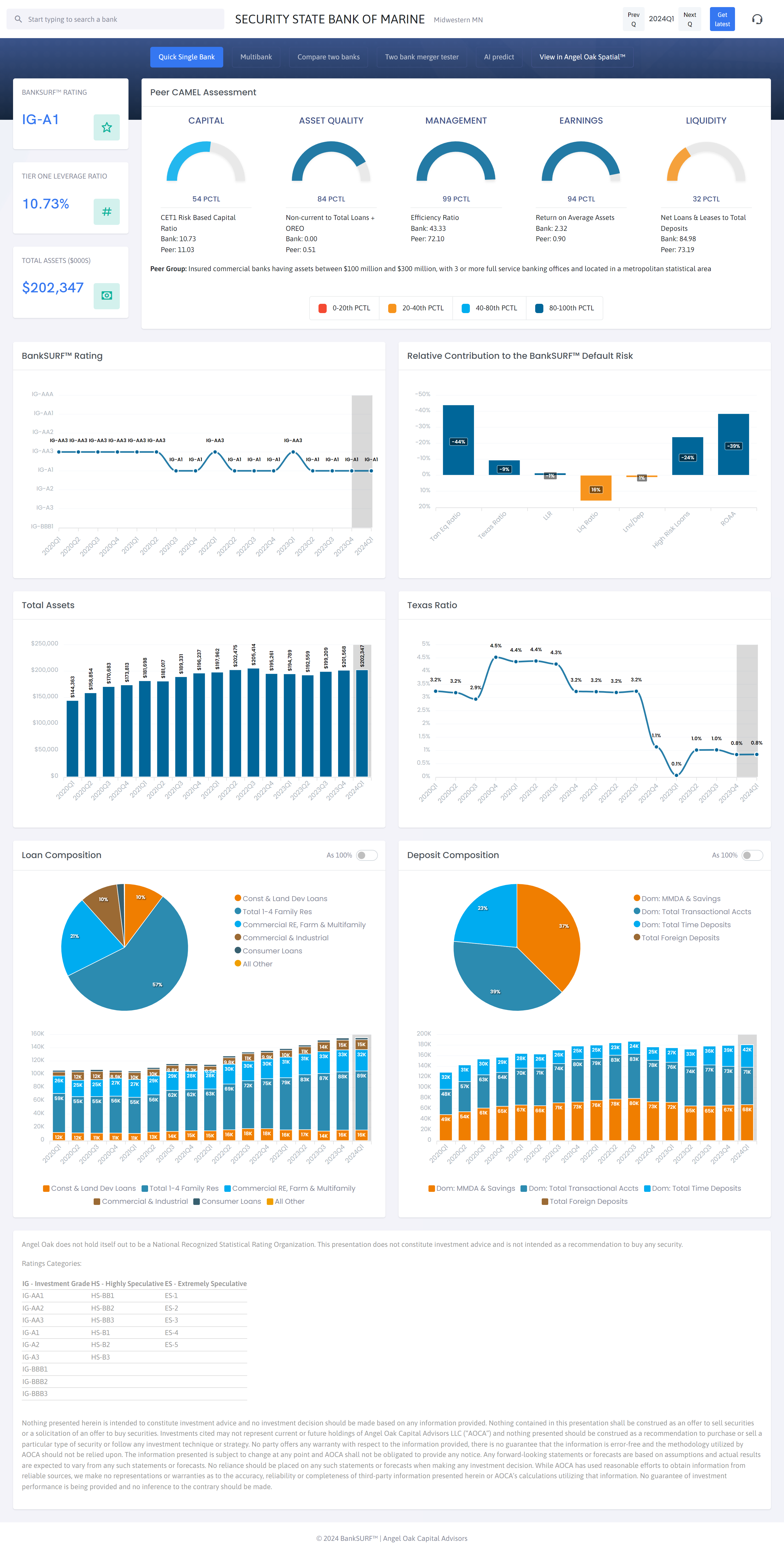 For investment bankers and analysts, this tool goes beyond standard metrics like net interest margins or loan-to-deposit ratios. By incorporating Angel Oak's CAMEL-based algorithm, the app provides deeper insights into how well a bank is positioned in terms of capital resilience, asset risk, operational efficiency, profitability, and liquidity management—elements that are vital for making informed investment and regulatory decisions.